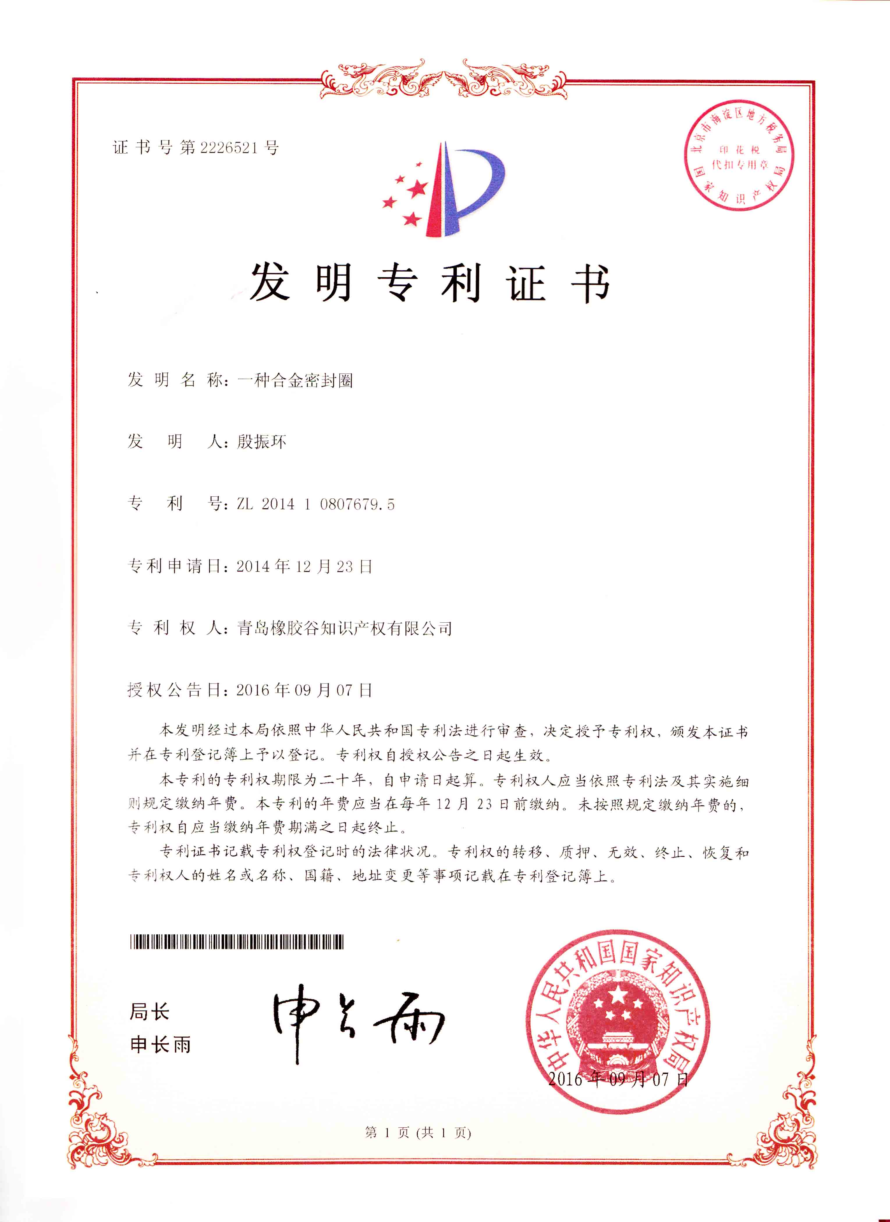• 一種合金密封圈的專利證書